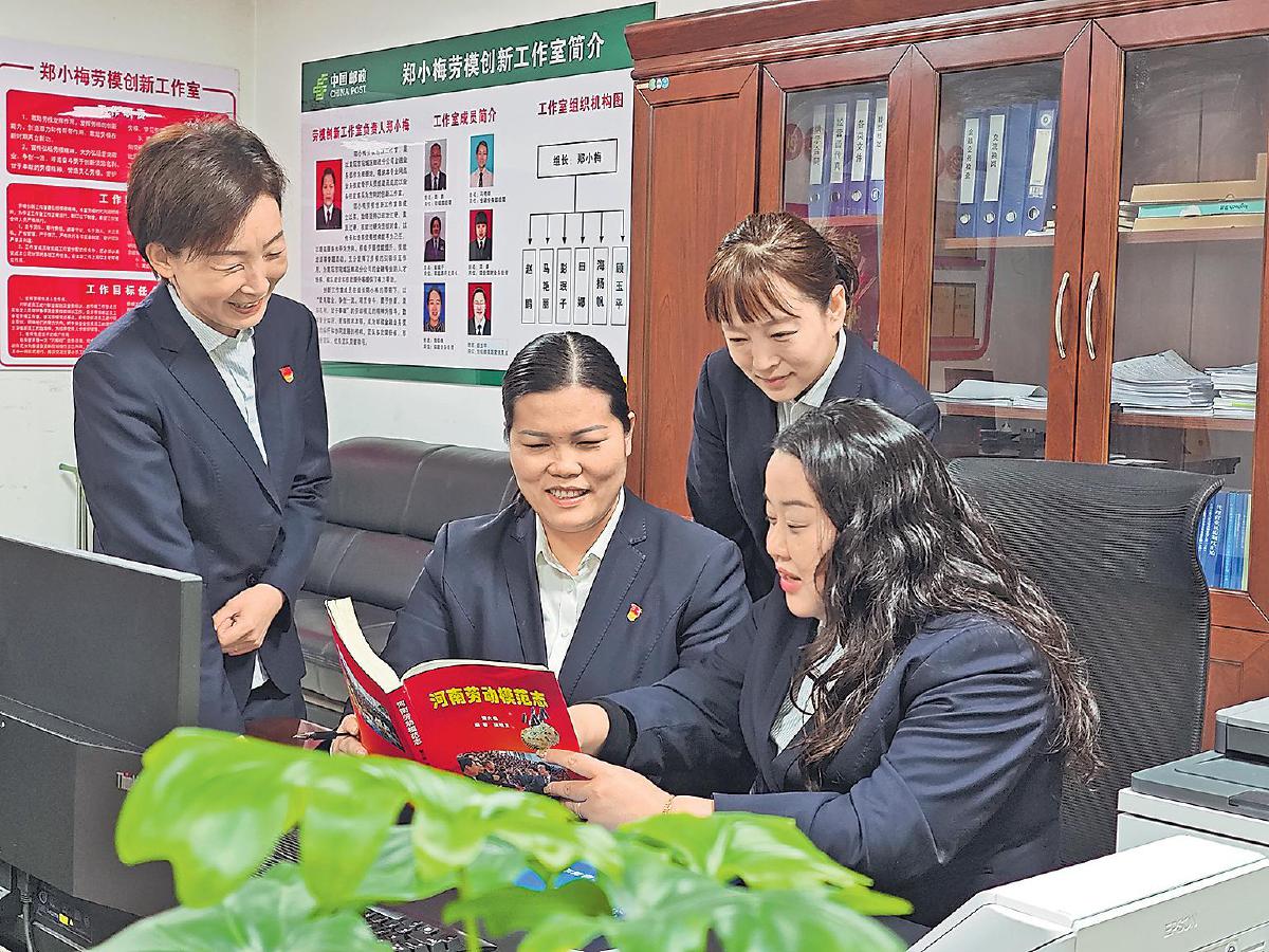 郑小梅(左二)与劳模创新工作室成员交流学习。