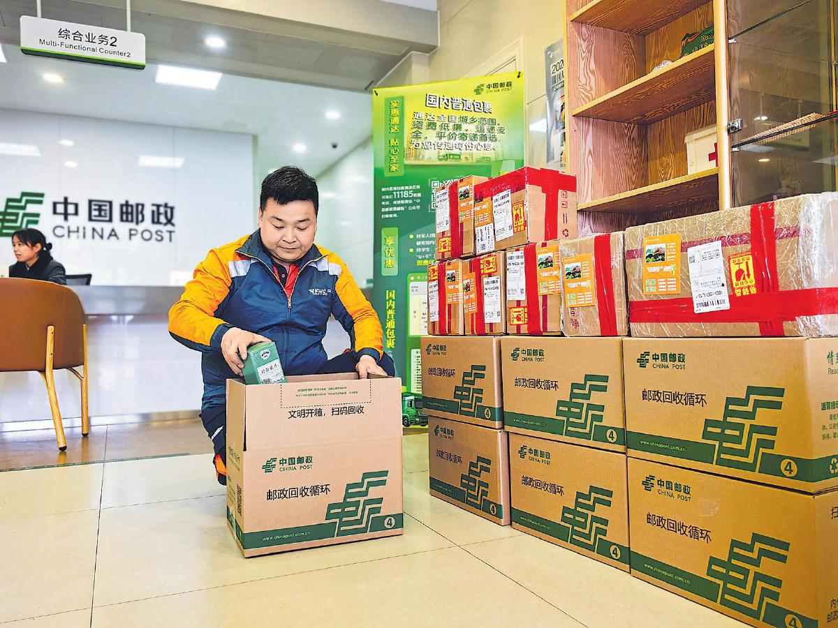 右图:3月27日,揽投员为茶叶打包、粘贴“极速鲜”标签。