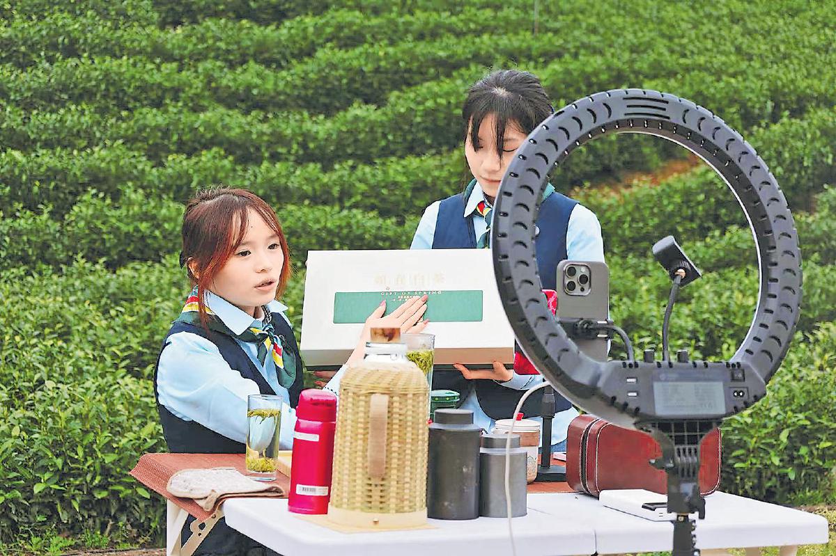 3月31日,在安吉茶山上,邮政工作人员开展明前白茶专场直播。
