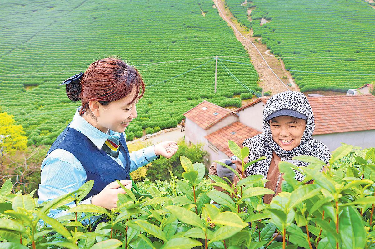 3月31日,在安吉茶山上,邮政工作人员帮茶农采摘春茶。