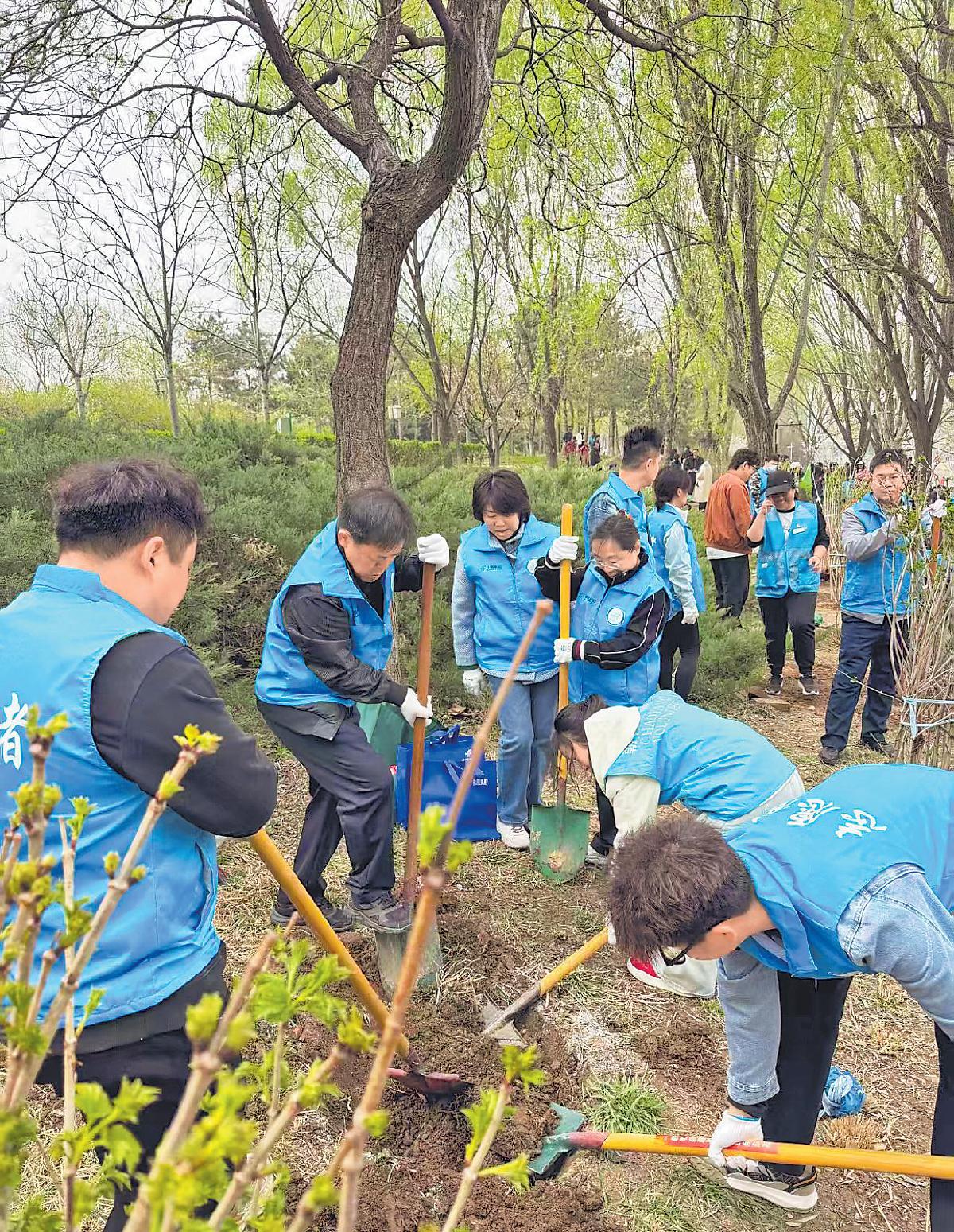 4月3日,北京市朝阳区邮政分公司20余名员工代表来到望和公园,以一场“手植一棵树 绿化一片天”的义务植树活动,为刚刚启幕的“花开北京·醒春启航”系列活动增添一抹亮眼的“邮政绿”。图为邮政志愿者挥锹挖坑、扶苗培土、围堰浇水,精心栽种树苗。 □吴玉兰 许旭 李晨 摄影报道