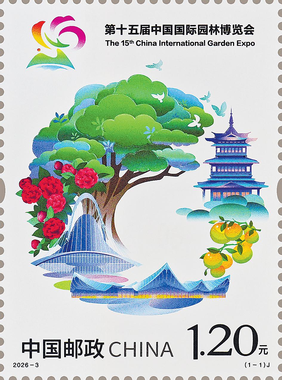 《第十五届中国国际园林博览会》纪念邮票以和谐共生为理念,表现了绿树、山茶花、瓯柑等植物元素以及本届园博会的核心园林景观和宣传标识。画面中,植物与场馆随曲线舒展,展现出人与自然相映相生的诗意格局,体现出中国传统“阴阳”哲学理念与融合共生的生态美学图景,蕴含了人文盛会根植于自然之道的文化内涵。