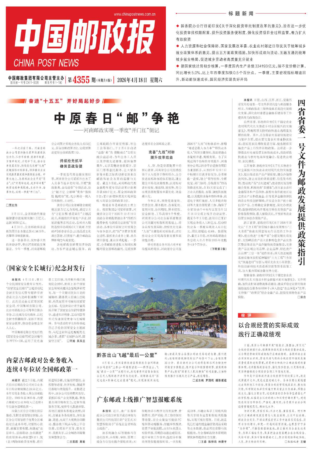 4月10日,贵州省黔东南苗族侗族自治州邮政分公司启动“上春山·邮路新启航——黔茶出山,飞越‘最后一公里’”主题行动,标志着贵州省首条偏远山区无人机邮路开启常态化运营。该邮路采用“固定巡航+阶梯式定点投递”模式,实现高效双向运输:清晨从雷山县西江邮政支局运送包裹、报刊进村;返程则搭载脚尧村出产的茶叶下山,全程仅需30分钟。黔东南州分公司还将在邮乐网为脚尧村开设官方旗舰店,集中展示和销售银球茶、苗族刺绣等产品;策划“跟着无人机逛脚尧”系列直播,以独特视角推介当地风光与产品,助农增收。