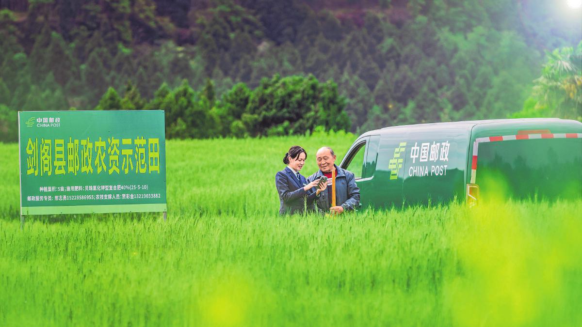 ①4月10日,在四川省剑阁县汉阳镇中心村示范田内,邮政工作人员为农户讲解新型复合肥的科学施用要点。 □张平摄