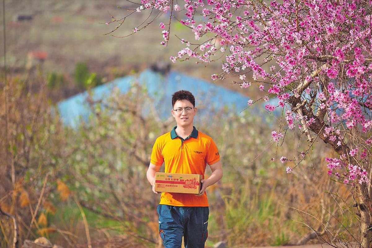 ②4月9日,山东省沂源县,邮政工作人员深入当地果园,为果农提供寄递服务。