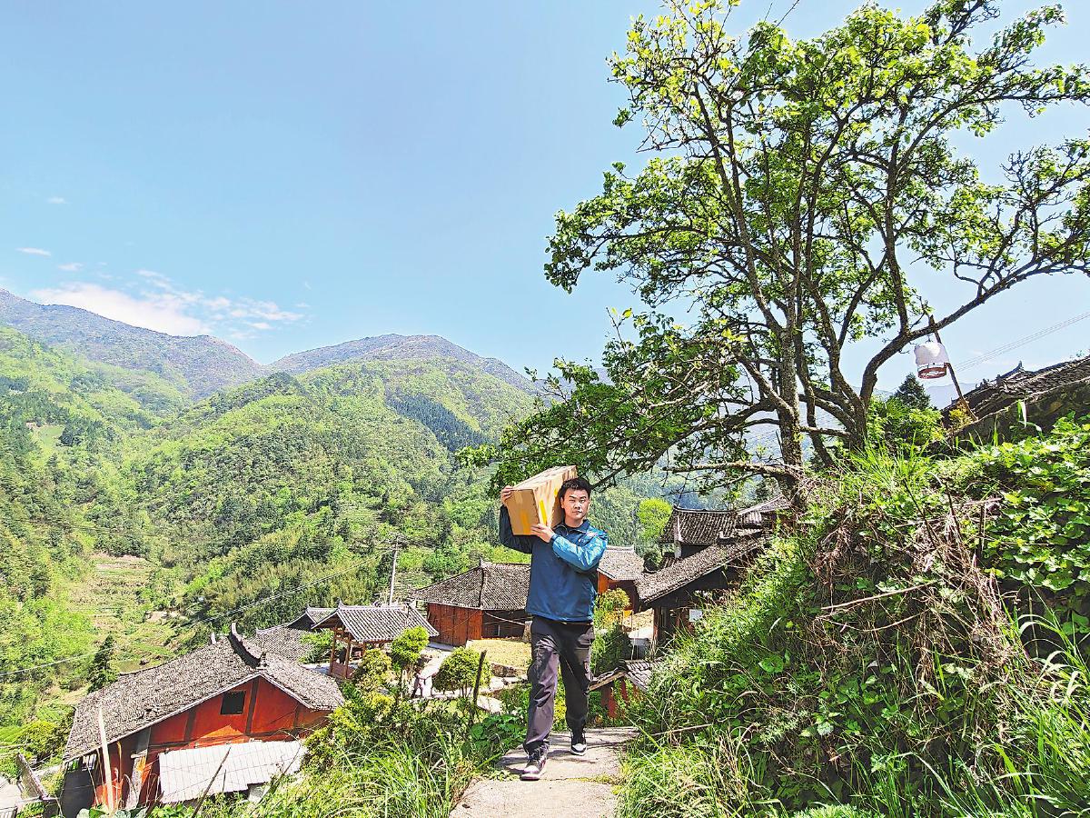 ③4月10日,贵州省雷山县雷公山苗岭侗寨,乡邮员上门投递包裹。 □韩静桦摄