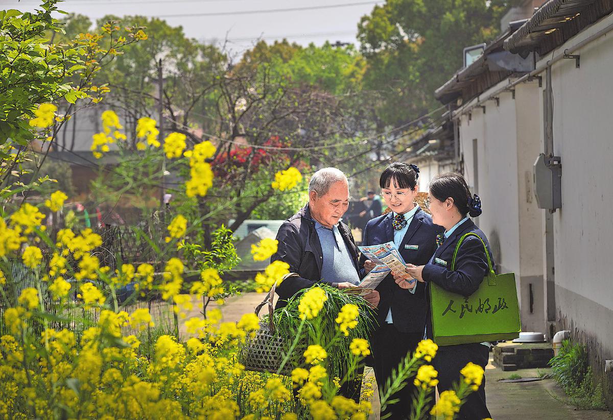 ④4月10日,江苏省常州市奔牛镇,邮政工作人员走进农户小院,向村民宣讲金融反诈知识。 □吴敏摄
