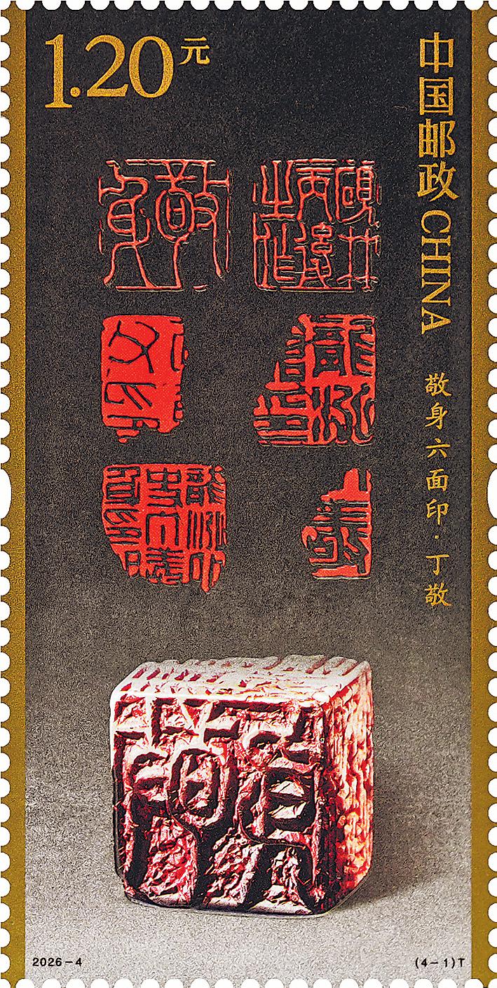 邮票第一枚内容为丁敬的《敬身六面印》。丁敬是浙派篆刻开山鼻祖,西泠八家之首。他独创切刀法,风格清刚朴茂。《敬身六面印》为其一生非常重要的自用印。此石原为明末梁千秋所刻子母印,丁敬偶得后制成五面,后经火灾补刻第六面“砚林丙后之作”。朱文两面取法小篆,线条瘦硬挺拔;白文四面取法汉缪篆,方正茂密而生动奇崛,完美践行“古人篆刻思离群”的印学主张。