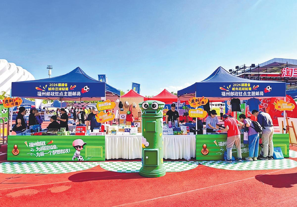 4月19日,2026年福建省城市足球联赛(“闽超”)拉开帷幕。福州市邮政分公司将服务“闽超”作为融入地方文体经济的重要抓手,与“闽超”福州赛区深度合作,获得了“闽超”福州足球队官方IP授权和比赛场地核心区域广告权限。比赛当日,福州市分公司在福州海峡奥体中心核心区域设立“闽超”主题临时邮局,推出多款赛事专属纪念邮戳及产品,将绿茵豪情与福州元素浓缩于方寸之上。纪念邮折、纪念封、福州足球队队徽套装等产品获得赛事组委会重点推介。 □冯亦 潘晨煜 摄影报道
