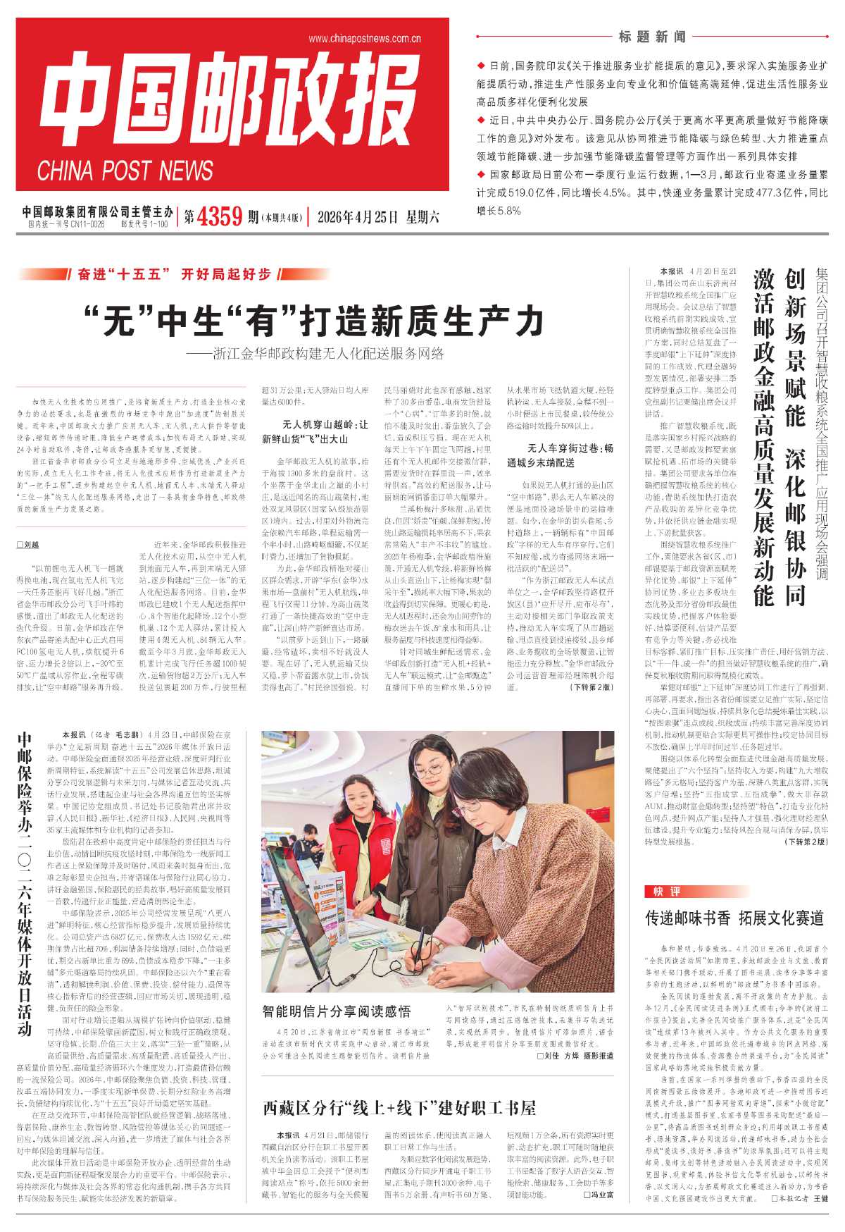 本报讯(记者 毛志鹏)4月23日,中邮保险在京举办“立足新周期 奋进十五五”2026年媒体开放日活动。中邮保险全面通报2025年经营业绩,深度研判行业新周期特征,系统解读“十五五”公司发展总体思路,坦诚分享公司发展逻辑与未来方向,与媒体记者互动交流、共话行业发展,搭建起企业与社会各界沟通互信的坚实桥梁。中国记协党组成员、书记处书记殷陆君出席并致辞。《人民日报》、新华社、《经济日报》、人民网、央视网等35家主流媒体和专业机构的记者参加。殷陆君在致辞中高度肯定中邮保险的责任担当与行业价值,动情回顾抗疫攻坚时刻,中邮保险为一线新闻工作者送上保险保障并及时赔付,风雨来袭时挺身而出,危难之际彰显央企担当,并寄语媒体与保险行业同心协力,讲好金融强国、保险惠民的经典故事,唱好高质量发展同一首歌,传递行业正能量,营造清朗舆论生态。中邮保险表示,2025年公司经营发展呈现“八更八进”鲜明特征,核心经营指标稳步提升,发展质量持续优化。公司总资产达6827亿元,保费收入达1592亿元,续期保费占比超70%,利润储备持续增厚;同时,负债端更优,期交占新单比重为69%,负债成本稳步下降,“一主多辅”多元渠道格局持续巩固。中邮保险还以六个“重在看清”,透彻解读利润、价值、保费、投资、偿付能力、退保等核心指标背后的经营逻辑,回应市场关切,展现透明、稳健、负责任的险企形象。面对行业增长逻辑从规模扩张转向价值驱动、稳健可持续,中邮保险擘画新蓝图,树立和践行正确政绩观,坚守稳慎、长期、价值三大主义,落实“三轻一重”策略,从高质量供给、高质量需求、高质量配置、高质量投入产出、高质量价值分配、高质量经济循环六个维度发力,打造最值得信赖的一流保险公司。2026年,中邮保险聚焦负债、投资、科技、管理、改革五端协同发力,一季度实现新单保费、长期分红险业务高增长,负债结构持续优化,为“十五五”良好开局奠定坚实基础。