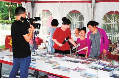 7月20日,江苏省沛县邮政分公司与县文明办合作,邀请多家出版社联合举办为期15天的“推动全民阅读,共建书香沛县”大型图书棚展活动。此次棚展活动展出的书籍多达2000余种,合计5万余册。沛县分公司还将拿出一定比例的图书销售款用于沛县特困学生的定向资助。截至7月31日,活动已实现图书销售13万元。图为县电视台正对图书棚展活动进行采访报道。□陈震 摄影报道