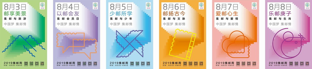 8月3~8日,中国邮政集团公司联合中华全国集邮联合会举办了“2019集邮周”,活动延续“中国梦 集邮情”的主题,延续“天天有活动、处处有看点、人人有收获”的总体规划,以各级集邮协会和邮政企业为主搭建活动平台,引导社会集邮骨干和广大集邮爱好者开展形式多样的“集邮周”活动。6天6个主题日,异彩纷呈,丰富多彩:集邮与旅游——“邮享美景”,集邮会员日——“以邮会友”,集邮与少年——“少邮所学”,集邮与文脉——“邮扬古今”,集邮与爱情——“爱邮心生”,集邮与生肖——“乐邮庚子”。