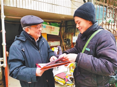 2020年1月1日,为了切实、有效提高报刊投递质量,江苏省徐州市邮政分公司寄递事业部要求每一位投递员在投递新年第一份报纸时,一定要上门投递,与客户“面交”,并详细核对客户新年度订阅的报刊,以防错漏。此举受到报刊订户的普遍赞誉,订户纷纷向投递员竖起大拇指,表扬他们做得好。图为该分公司南区投递部投递员蔡翔宇在奎园小区与客户核对新年度报刊。□谢安吉 摄影报道