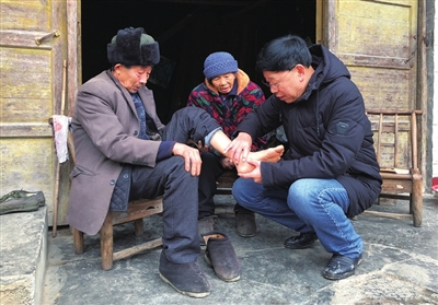 听说贫困户胡洋朋脚扭伤后,陈泽维到他家看望。胡洋朋像看到自家人一样伸出脚让陈泽维查看伤势。 |