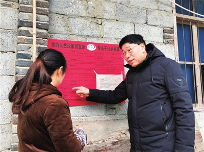 陈泽维向6组贫困户庞召华的妻子详细讲解可享受的低保、教育资助、危房改造补贴、无障碍厕所改造、免交合作医疗费用等扶贫保障政策。在布袋溪村,每家贫困户门前都张贴着“扶贫干部到我家”的公示牌。 |