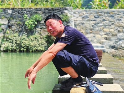 走访期间因天气炎热,陈泽维就在沟渠中掬水洗脸。 |