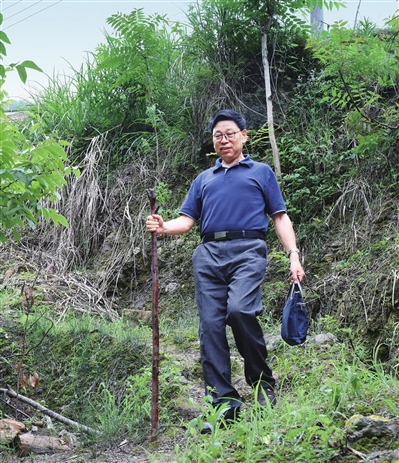 走访贫困户遇到山路陡峭时,陈泽维用树枝作拐杖。 |