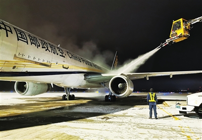 1月5日傍晚至1月6日凌晨,2020年首场大雪按约定时间来京城报到。正逢“小寒”节气,北风呼啸,温度降至零下5摄氏度。为确保飞行安全,中国邮政航空有限责任公司机务人员顶风冒雪,对凌晨3点执行航班的飞机进行除雪作业。□北京记者 杨卫东 通讯员 潘再峰 摄影报道