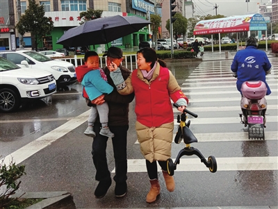1月2~9日,邮储银行湖北省黄冈市分行组织30名青年志愿者在城市主干道交叉路口开展“文明交通劝导”志愿服务活动。志愿者身穿印有“中国志愿服务”字样的红马甲,统一佩戴“志愿者服务队”袖章,配合交警为行人宣讲交通法规知识,热情引导行人安全文明过马路。图为志愿者主动为一名抱小孩的行人撑伞、提东西,帮助其安全过马路。□闫阳春 摄影报道