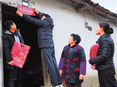 邮储银行安徽省金寨县支行通过开展“新春大走访”活动,走村入户为广大村民送去新春文化礼包及基础金融知识,为新春佳节增添喜庆祥和的氛围。图为该支行宣传小组成员为村民贴春联。□李明 摄影报道 |