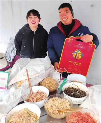 邮储银行陕西省渭南市分行开展了“翰墨飘香 迎春送福”送春联活动。该分行员工为没有时间采购年货的商户们送去了春联及新春礼包,将邮储银行的祝福送到了家。图为一家小吃摊商户高兴地展示邮储新春礼包。□张方 摄影报道 |